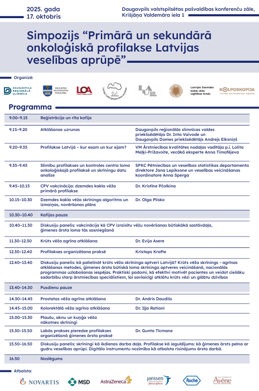 Daugavpils reģionālā slimnīca un Daugavpils valstspilsētas pašvaldība sadarbībā ar  vadošajām ārstu asociācijām, 2025. gada 17. oktobrī rīko simpoziju “Primārā un sekundārā onkoloģiskā profilakse Latvijas veselības aprūpē”.
